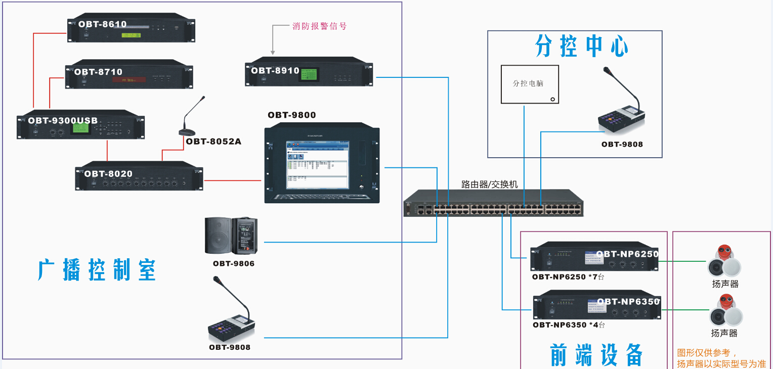 公共廣播設計按留上海悅興國際大酒店的功能劃分廣播分區,每個分區設計一臺獨立功放,確保每個區域可以獨立的播放節目和獨立廣播講話;公共廣播系統采用OBT高集成多分區模塊式(插卡式)廣播系統,高集成多分區模塊式(插卡式)廣播系統是一套支持64個信號分區的公共廣播系統,系統由管理主機、控制模塊、管理模塊、消防信號發生模塊、消防智能接口模塊、MP3播放模塊、收音機模塊、輸出矩陣模塊、電話模塊等主要核心設備組成,解決了公共廣播的背景音樂播放、遠程尋呼廣播、消防應急廣播、定時播放音樂等使用功能;高集成模塊式分區矩陣控制主機為系統的管理主機,主機內置有控制模塊、管理模塊、消防信號發生模塊、消防智能接口模塊、MP3播放模塊、收音機模塊、輸出矩陣模塊、電話模塊等,系統最大支持8套節目輸出、64路節目輸出;主機連接管理軟件,可實現手動和自動控制節目播放,在軟件上可直觀操作64路輸出音樂播放,可實現電話廣播、無線遙控廣播功能,連接電源時序器,可手動或自動管理設備電源;主機最多可同時支持8臺遠程尋呼站工作,遠程尋呼站可以遠程尋呼講話,同時遠程對64路輸出音樂播放管理和控制;系統支持分控功能,除了在主控室安裝管理軟件,還可以在酒店的服務臺安裝遠程操作軟件,遠程播放節目,高集成板卡模塊設計,簡單的系統設備配置,眾多的使用功能,滿足酒店日常的背景音樂播放、自動節目播放、遠程尋呼、本地尋呼、遠程控制、火災應急廣播的使用。